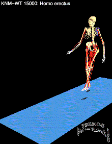 This is a model of a 1.5 million year old Homo Erectus specimen, a teenage boy from the site of Nariokotome, west of Lake Turkana in Kenya. This is the most complete skeleton known of all fossil homonids. Blue portions of bone are mirrored and white portions of bone are reconstructed from modern bones.